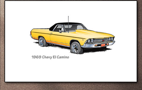 1969 Chevy El Camino PRINT is LEGAL size (14" X 8.5") printed on high quality acid free white paper and signed by the artist.