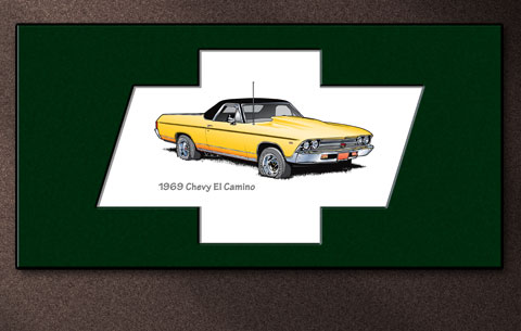 1969 Chevy El Camino MATTED PRINT is 20" X 10" and will fit a standard 20 X 10 frame available at Michael's, Hobby Lobby and all custom frame shops.