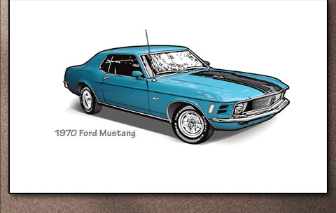 1970 Ford Mustang PRINT is LEGAL size (14" X 8.5") printed on high quality acid free white paper and signed by the artist.